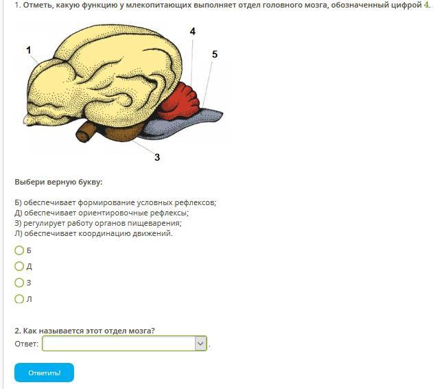 1. Отметь, какую функцию у млекопитающих выполняет отдел головного мозга, обозначенный цифрой 4.