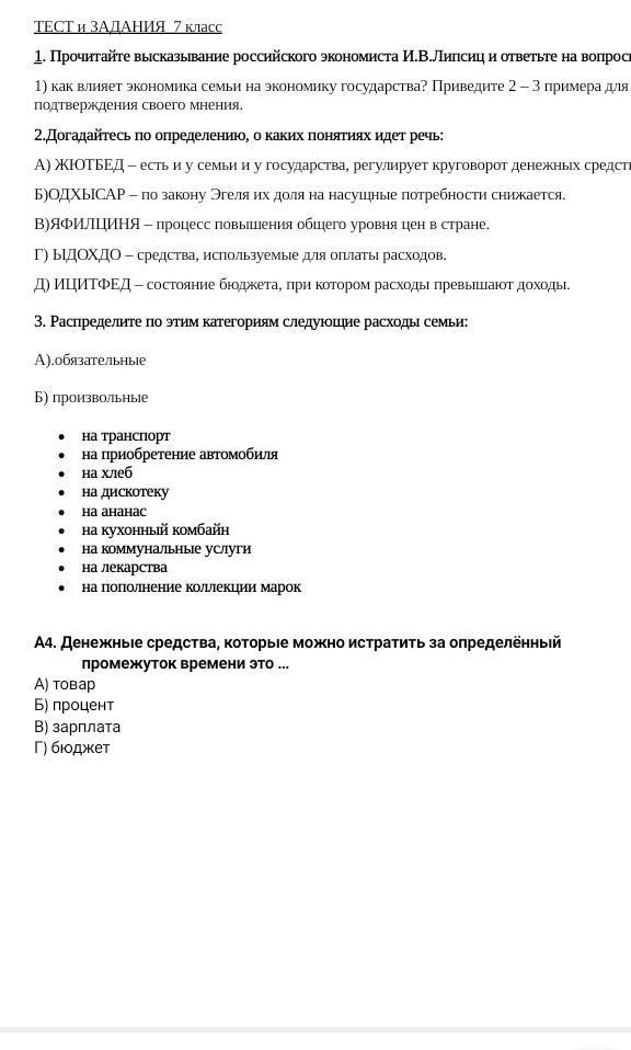 тест по обществознанию 7 класс по теме экономика семьи ​