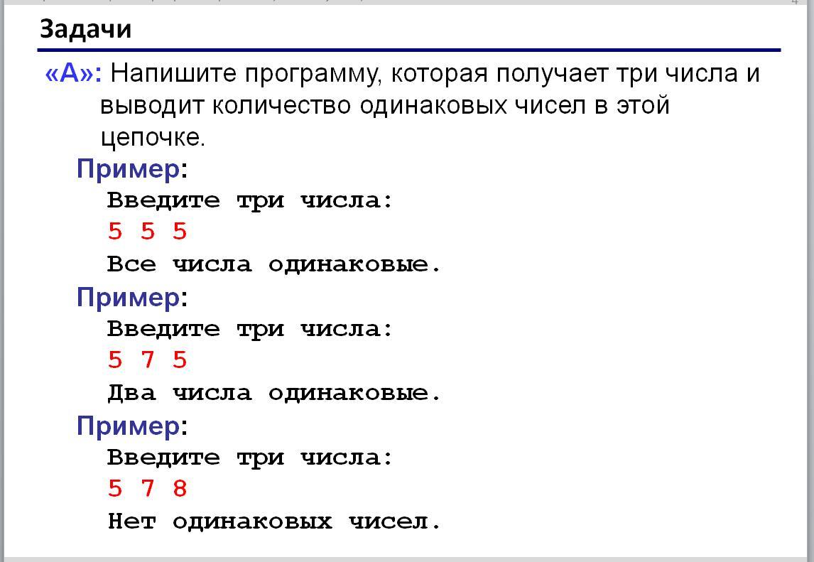 Напишите программу в Питоне(задачи, вторая картинка), которая получает три числа и выводит количество натуральных одинаковых чисел в этой цепочке. На примере того что снизу скинула...
