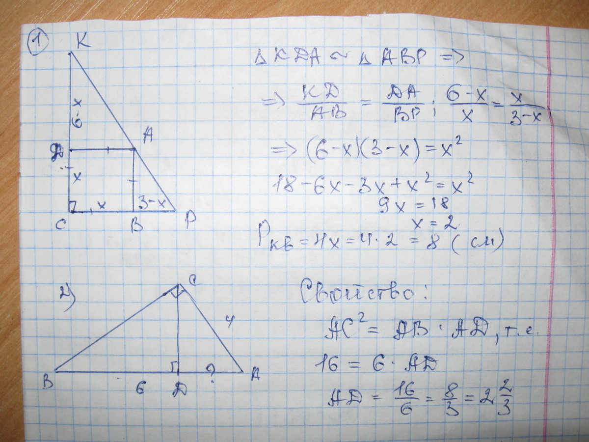 1) В прямоугольный треугольник вписан квадрат, имеющий с ним общий прямой угол. Найти периметр квадрата, если катеты треугольника соответственно равны 3 и 6.