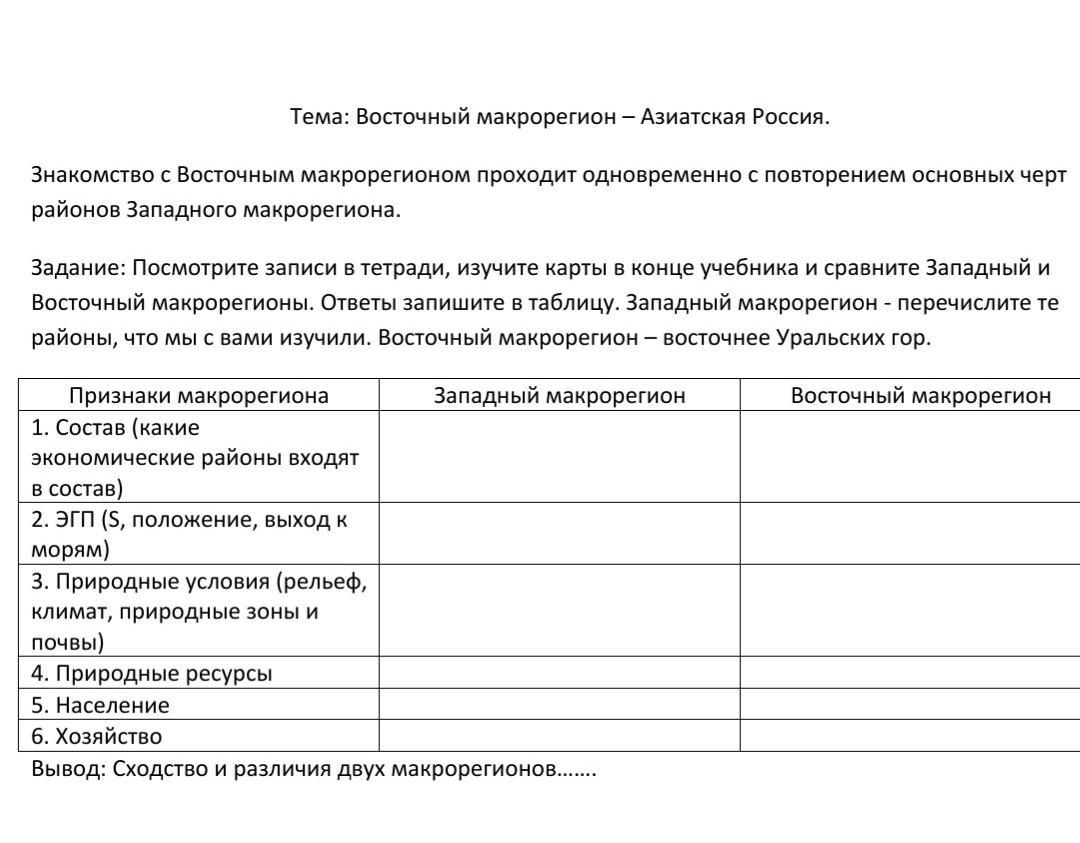 География таблица по Восточный макрорегион - Азиатская Россия​