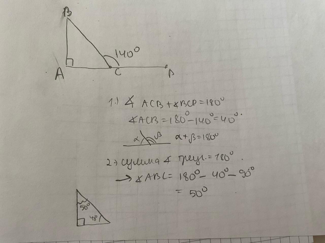 Дан прямоугольный треугольник ABC и внешний угол угла C. Определи велечины острых углов данного треугольника, если угол BCP =140°