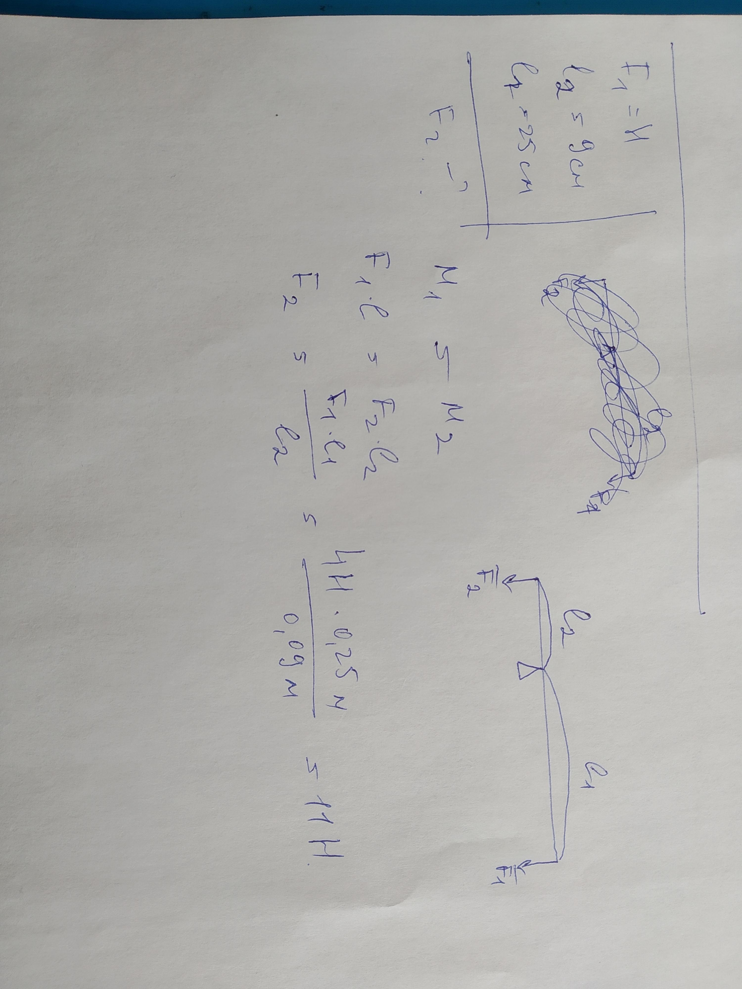 Меньшая сила, действующая на рычаг, равна 4 Н. Найдите большую силу, если плечи рычага 9 см и 25 см. 9ответ округлить до целых)