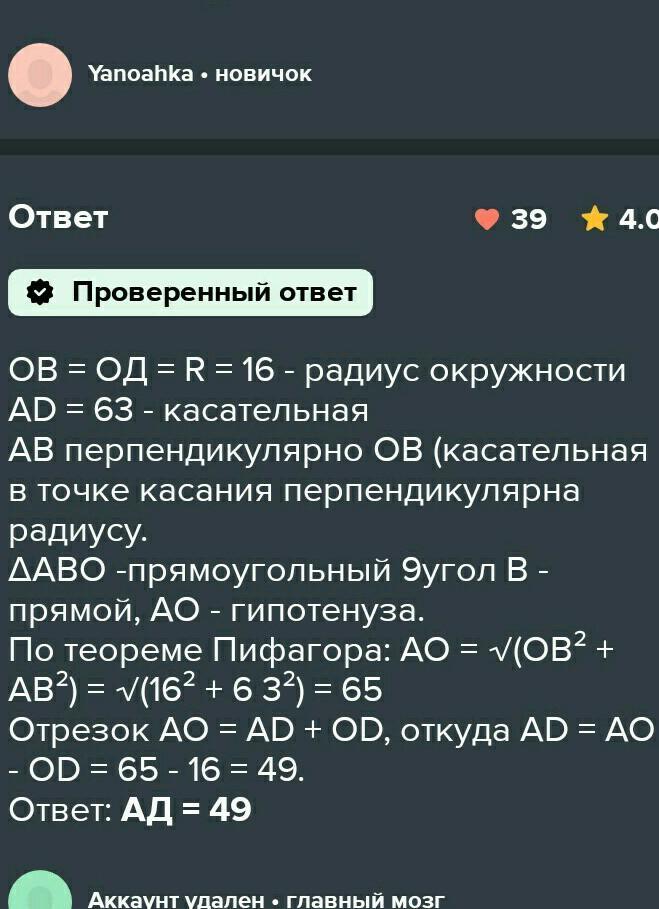 Отрезок AB = 63 касается окружности радиуса 16 с центром O в точке B. Окружность пересекает отрезок AO в точке D. Найдите AD.
