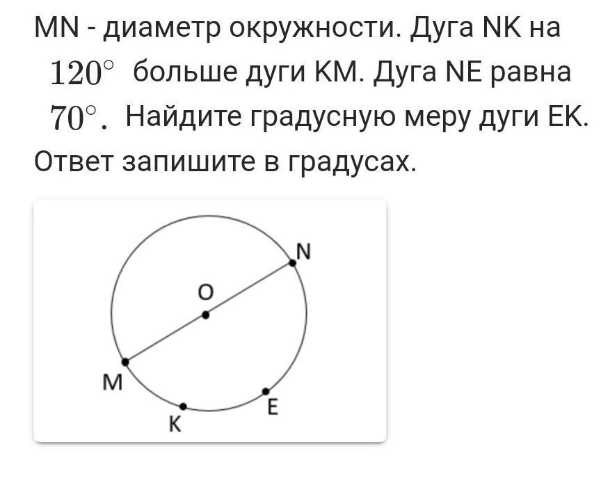 Найдите градусную меру дуги EK. Ответ запишите в градусах.