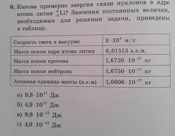 Какова примерно энергия связи нуклонов в ядре атома лития (6/3Li)? Значения постоянных величин необходимых для решения: