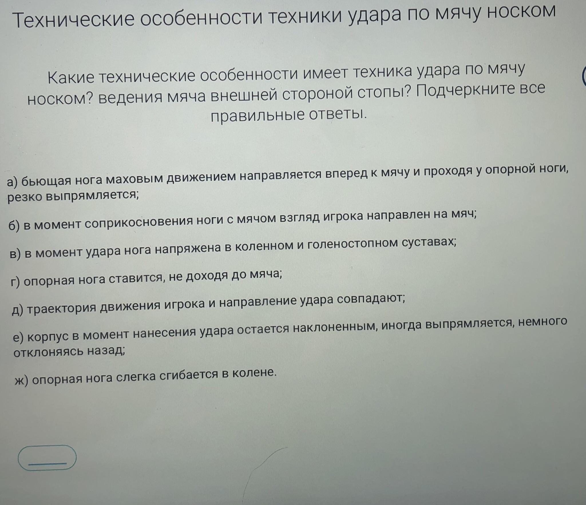 Какие технические особенности имеет техника удара по мячу носком? Веления мяча по внешней стороной стопы? Подчеркните все правильные ответы