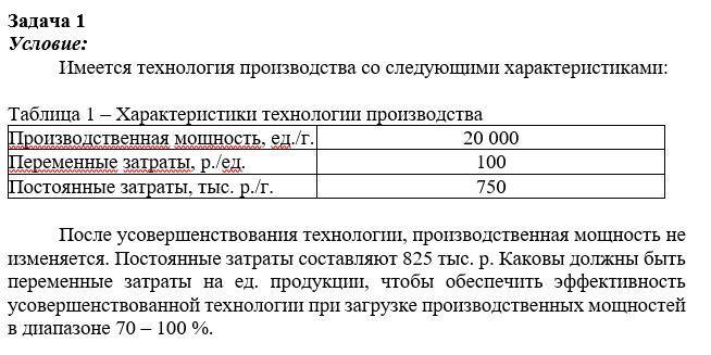 Расчитайте переменные затраты на единицу продукции, чтобы обеспечить эффективность усовершенствованной технологии при загрузке производственной мощности в диапазоне 70-100%.