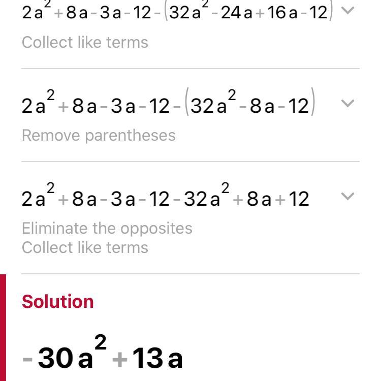 =2a^2+8a-3a-12-(32a^2-24a+16a-12) =