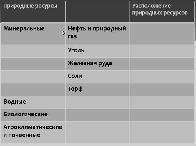 Природные ресурсы Западной Сибири. Заполнить таблицу