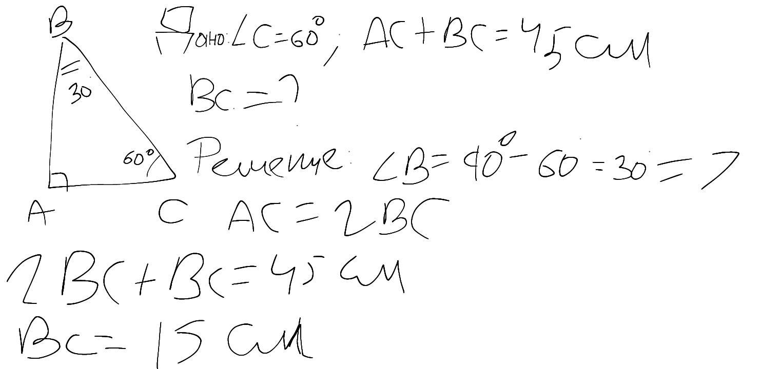 Пожалуйста помогите. В прямоугольном треугольнике сумма гипотенузы и меньшего катета равна 45см. Найдите гипотенузу треугольника, если один из его углов равен 60 градусов.