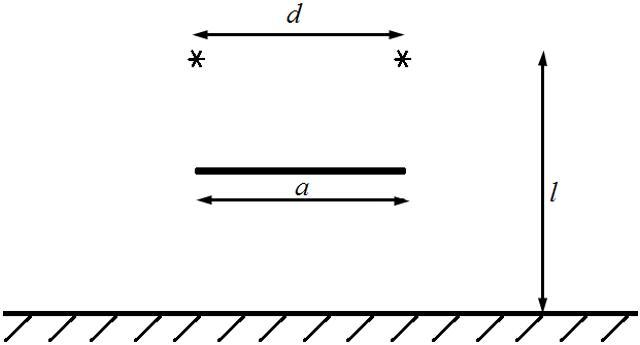 Два точечных источника света находятся на расстоянии d=50 см друг от друга и на расстоянии l=1 м от экрана. Посередине между источниками света и экраном параллельно плоскости экрана расположен непрозрачный квадрат со стороной a=50 см. Найдите площадь области тени и области полутени на экране.