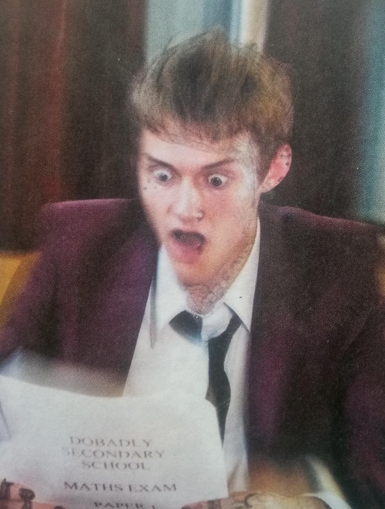the crazy student is trying to study his homework at night,because he has an exam tomorrow and he didnt study.