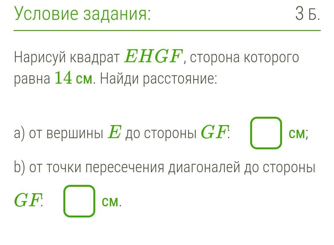 Нарисуй квадрат EHGF, сторона которого равна 14 см. Найди расстояние:
