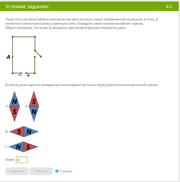 После того, как была собрана электрическая цепь согласно схеме, изображенной на рисунке, в точку A поместили магнитную стрелку и замкнули ключ. Определи, какое положение займет стрелка.