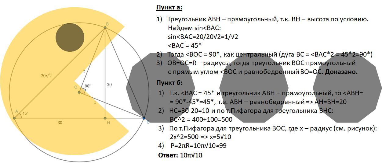 Треугольник ABC вписан в окружность с центром в точке O. AB=20 корней из 2, AC=30, высота, проведенная к основанию AC равна 20.