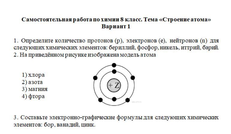 Самостоятельная работа по химии 8 класс. Тема «Строение атома»