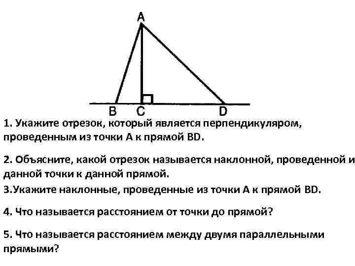 1. Укажите отрезок, который является перпендикуляром, проведенным из точки А к прямой BD. 2. Объясните, какой отрезок называется наклонной, проведенной и данной точки к данной прямой. 3. Укажите наклонные, проведенные из точки А к прямой BD. 4. Что называется расстоянием от точки до прямой? 5. Что называется расстоянием между двумя параллельными прямыми