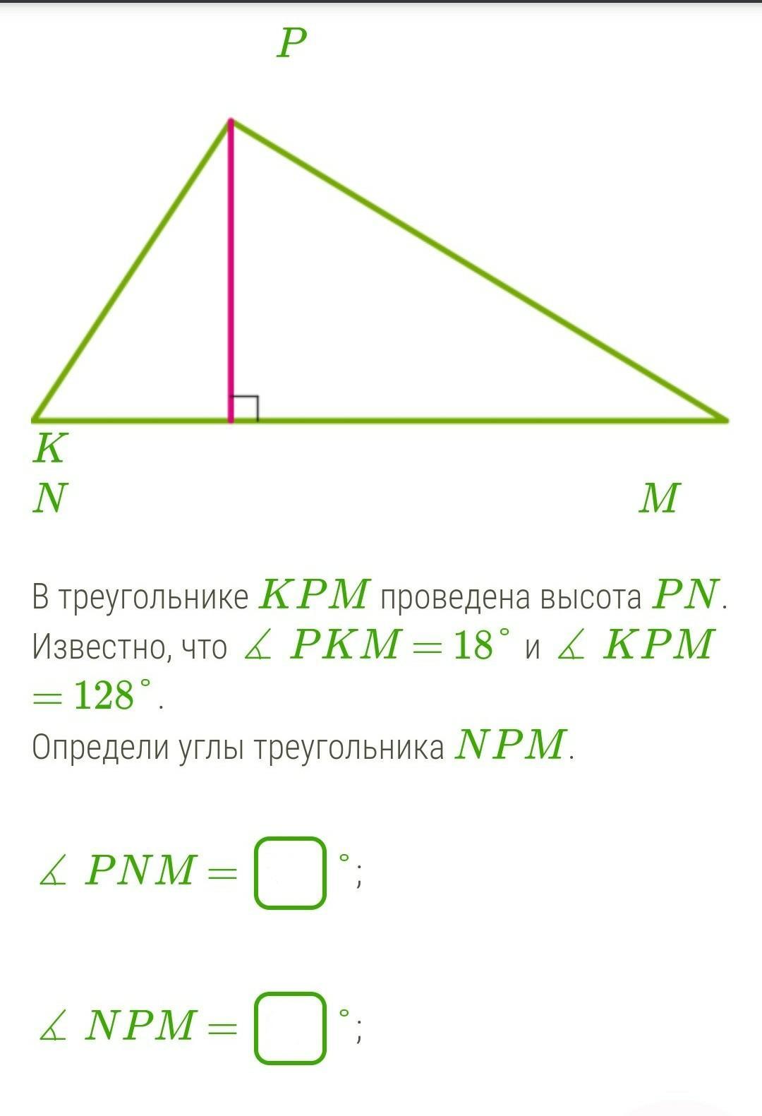 Известно, что ∡ PKM = 18° и ∡ KPM = 128°.