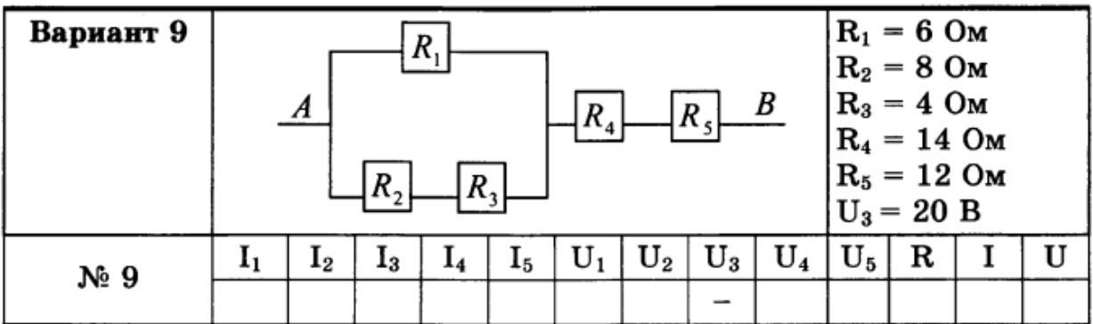 Определите значение силы тока и напряжения на каждом резисторе, полное сопротивление, полную силу тока и полное напряжение участка. Заполните таблицу.