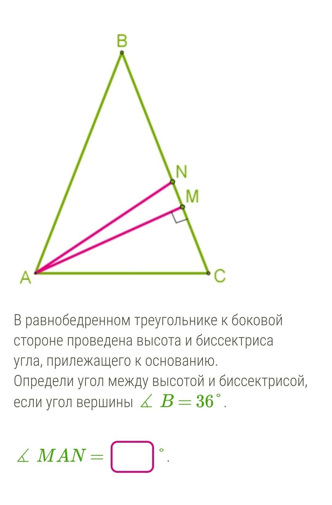 Определи угол между высотой и биссектрисой, если угол вершины ∡ B = 36°.