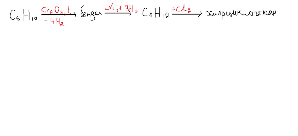 C6H10 -> бензол (C6H6) -> циклогексан (C6H12)