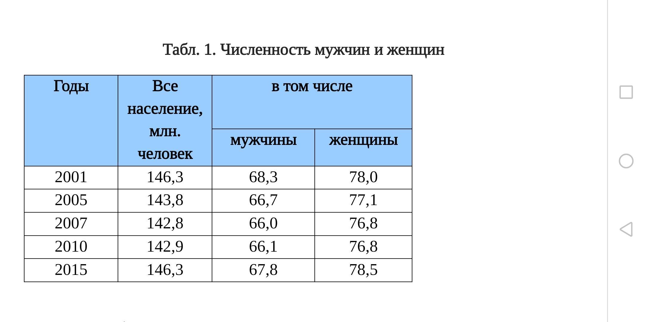Пользуясь статистическими данными [табл. 1], определите какова доля мужчин и женщин в 2001 году. Сделайте вывод о половом составе населения.