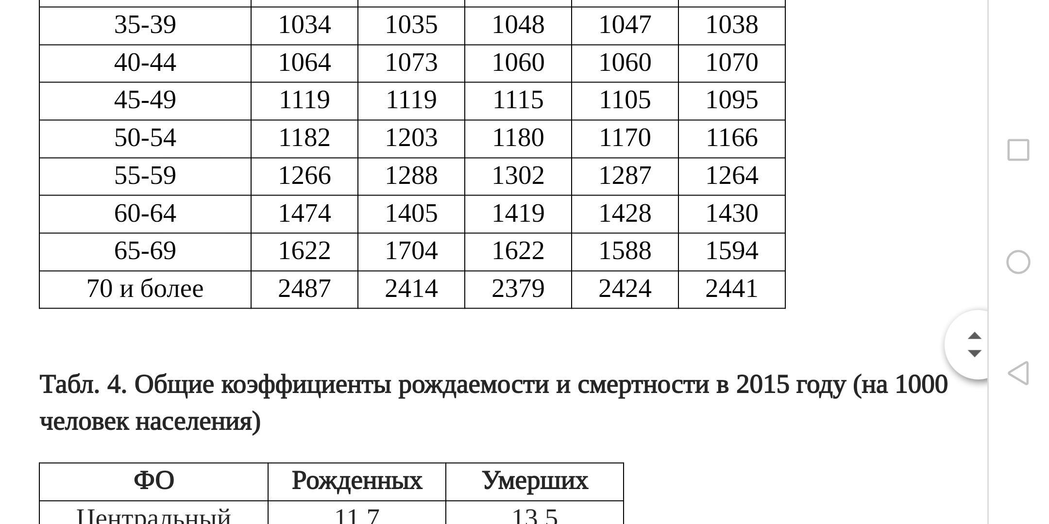 Пользуясь статистическими данными [табл. 4], определите естественный прирост в Сибирском и Центральном федеральных округах в 2015 году. Сформулируйте вывод о демографической ситуации в данных федеральных округах на 2015 год.