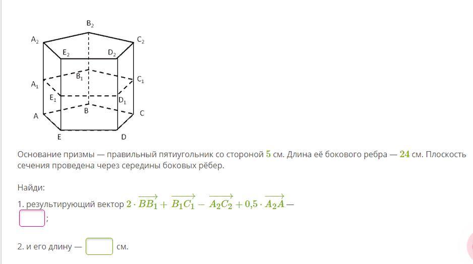 Основание призмы — правильный пятиугольник со стороной 5 см. Длина её бокового ребра — 24 см. Плоскость сечения проведена через середины боковых рёбер.