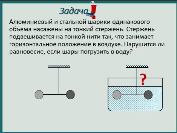 Алюминиевый и стальной шарики одинакового объема насажены на тонкий стержень. Стержень подвешивается на тонкой нити так, что занимает горизонтальное положение в воздухе. Нарушится ли равновесие, если шары погрузить в воду? * ?
