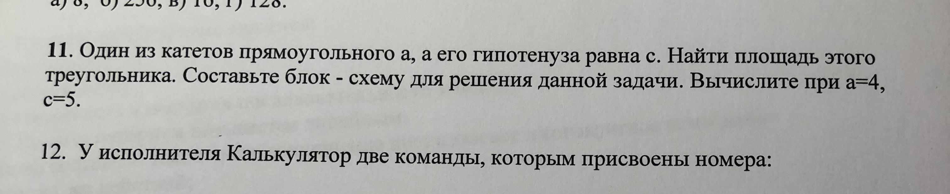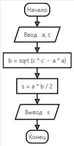 Один из катетов прямоугольного а, а его гипотенуза равна с. Найти площадь этого треугольника. Составьте блок - схему для решения данной задачи. Вычислите при а=4, с=5