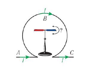 По круговому витку проходит электрический ток. Как расположится магнитная стрелка, если её поместить в центр витка? Действие магнитного поля Земли не учитывать.