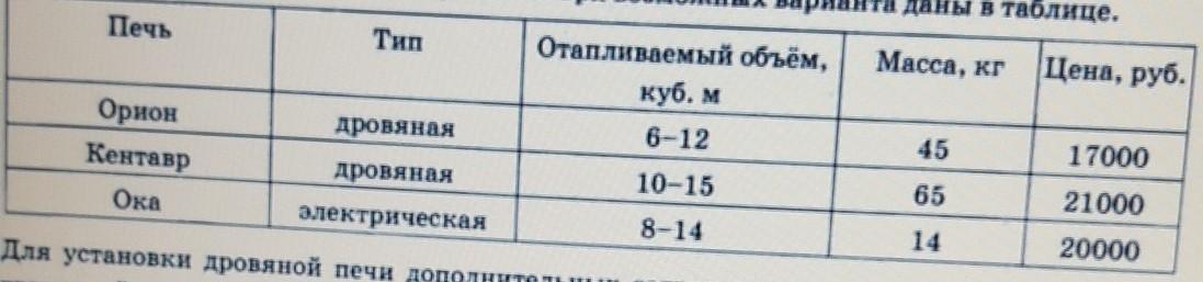 Хозяин дачного участка строит баню с парным отделением.Размеры парного отделения:длина 3,4 м, ширина 2м,высота 2,2 м. Для разогрева парного помещения можно использовать электрическую или дровяную печь. Три возможных варианта даны в таблице.