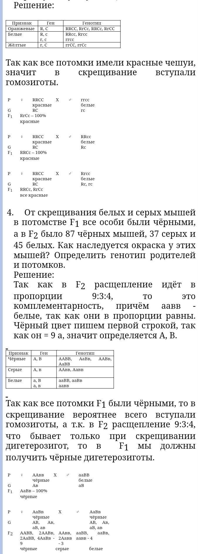 От скрещивания белых и серых мышей в потомстве F1 все особи были черными, а в F2 было 77 черных, 37 серых и 45 белых мышей. Как наследуется окраска у этих мышей? Определить генотипы родителей и потомков.