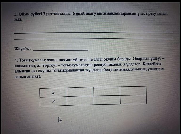 4. Шесть учеников посещают тогызкумалак и шахматные кружки. Трое из них - шахматисты, а четверо - национальные призеры в тогызкумалаке Определите закон распределения вероятности того, что два случайно выбранных студента получат приз в тогызкумалаке.