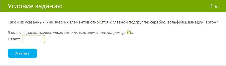 Вопрос: Какой из указанных химических элементов относится к главной подгруппе: серебро, вольфрам, ванадий, аргон?