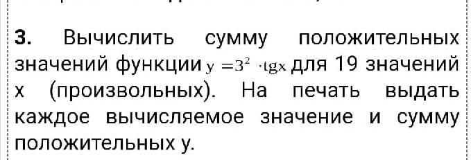 Вычислить сумму положительных значений функции y=3²*tgx для 19 значений x (произвольных). На печать выдать каждое вычисляемое значение и сумму.