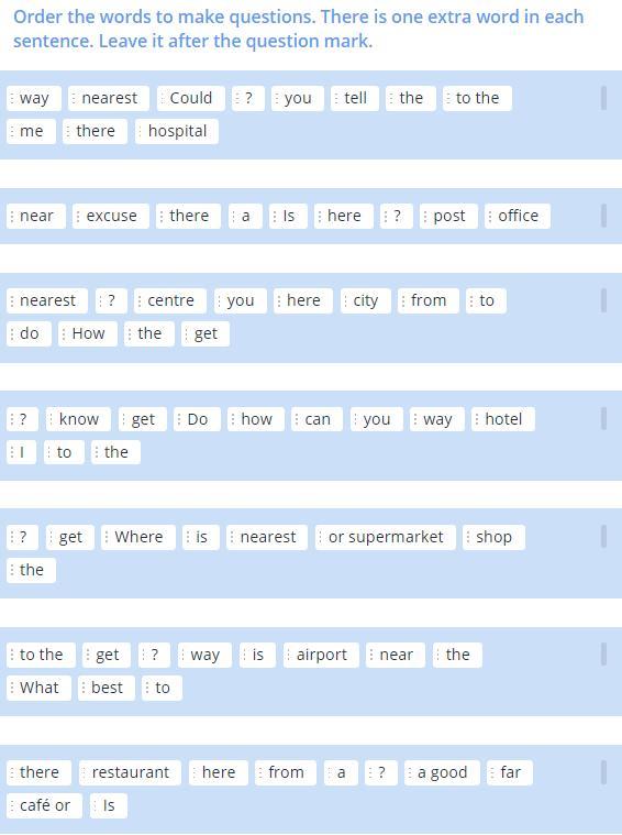 Order the words to make questions. There is one extra word in each sentence. Leave it after the question mark.