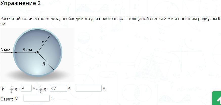 Рассчитай количество железа, необходимого для полого шара с толщиной стенки 3 мм и внешним радиусом 9 см.