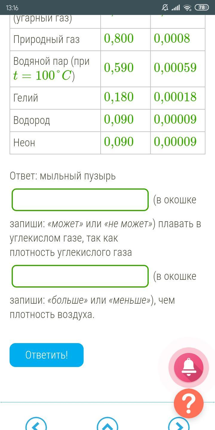 Подумай, может ли мыльный пузырь, наполненный воздухом, плавать в углекислом газе. Поясни почему. Весом пузыря пренебречь.