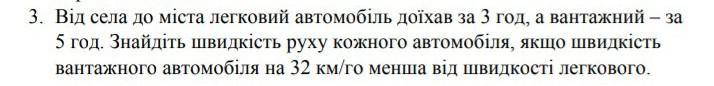 Швидкість вантажного автомобіля дорівнює х км/год, а швидкість легкового автомобіля більша на 32 км/год за швидкість вантажного автомобіля, тоді за швидкість легкового автомобіля дорівнює (х + 32) км/год.