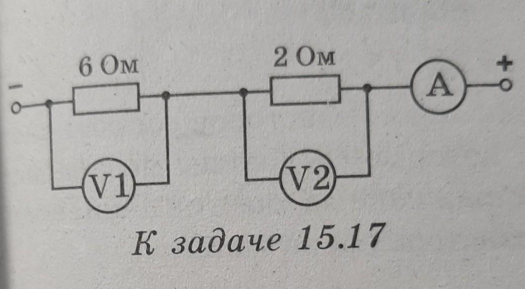 ОЧЕНЬ СРОЧНО! 15.17. Первый вольтметр (см. рисунок) показывает напряжение 18 В. Что показывают амперметр и второй вольтметр?