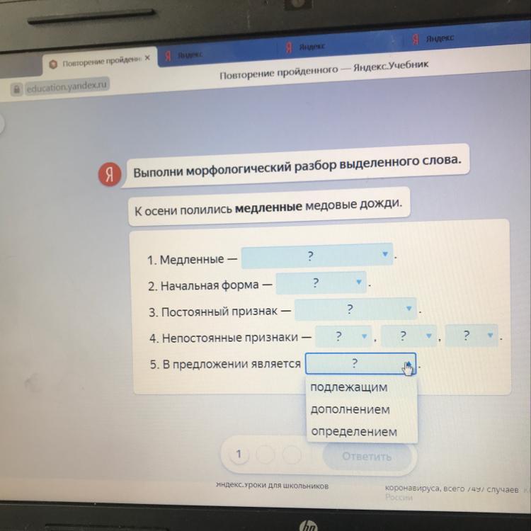 Неопределённая форма- медленный, множесвенное число, полная форма, Винительный падеж. Дожди (какие?) медленные, предложении будет являться определением.
