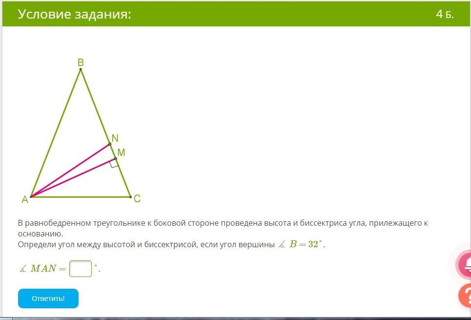 Определи угол между высотой и биссектрисой, если угол вершины ∡ B = 32°.