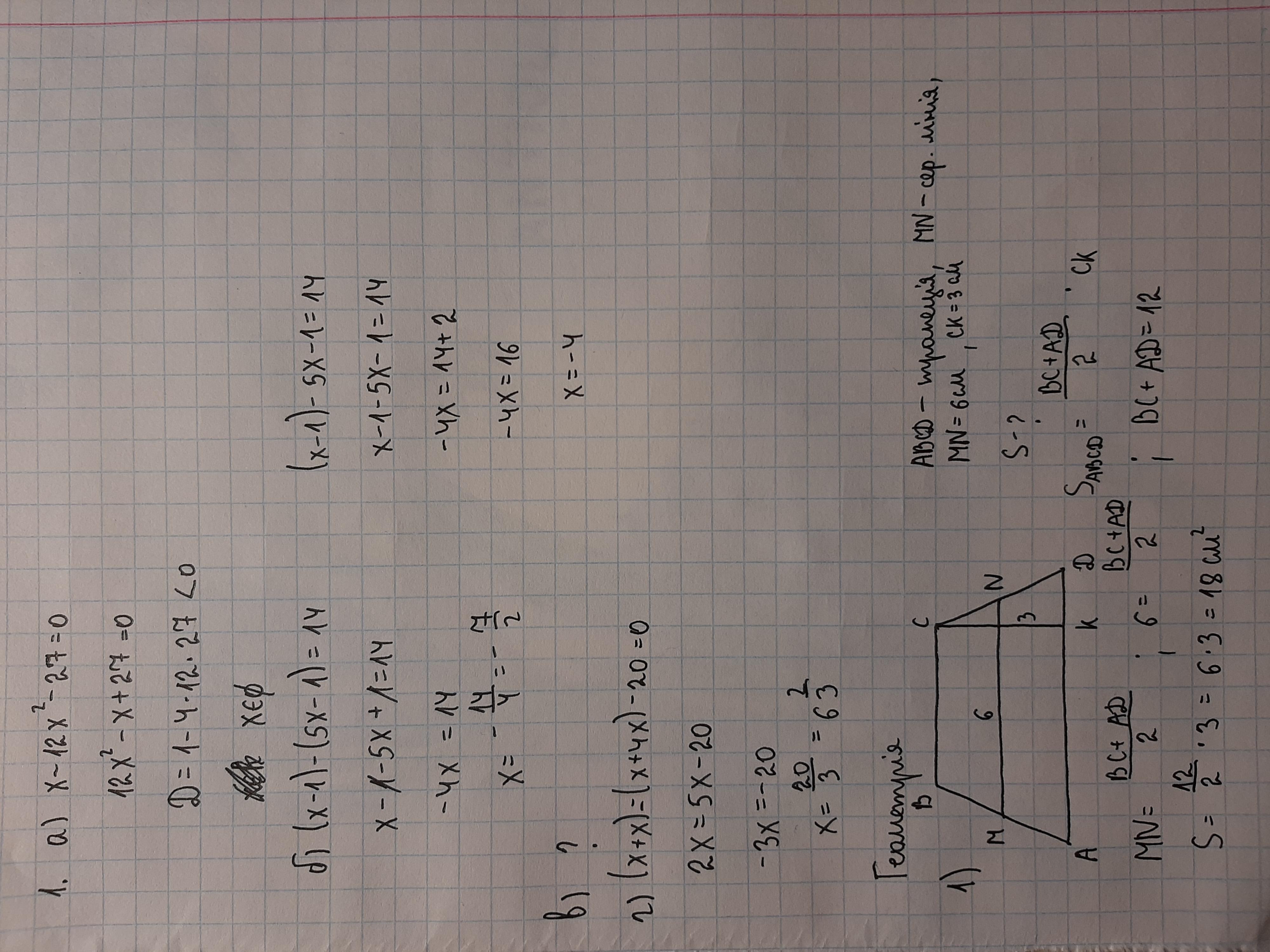 1. Середня лінія трапеції дорівнює 6см, а висота - 3см. Знайдіть площу трапеції.