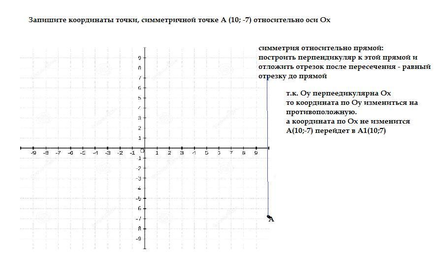 Запишите координаты точки, симметричной точке A (10; -7) относительно оси Ox
