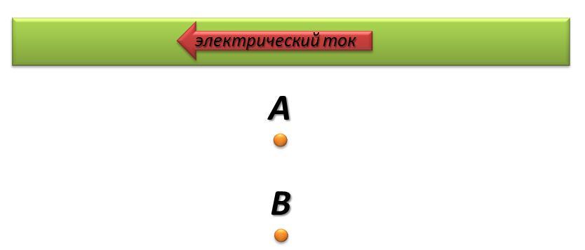 Обрати внимание, что точки A и B находятся обе снизу от проводника, но на разном расстоянии от него.
