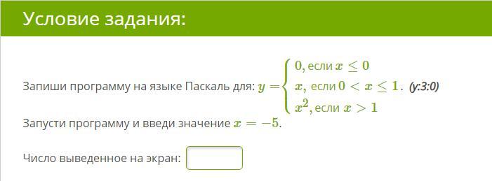 Запиши программу на языке Паскаль для: y=⎧⎩⎨⎪⎪0,еслиx≤0x, если01. (y:3:0)