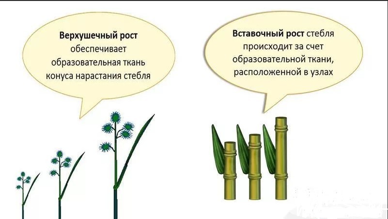 За рост растения отвечают образовательные ткани - меристемы. Рост побега в длину возможен за счет наличия верхушечной (апикальной) меристемы которая располагается на конце побега. Кроме того у злаковых растений присутствует еще один вид меристемы - вставочная которая находится в междоузлиях стебля и обеспечивает дополнительный рост стебля.