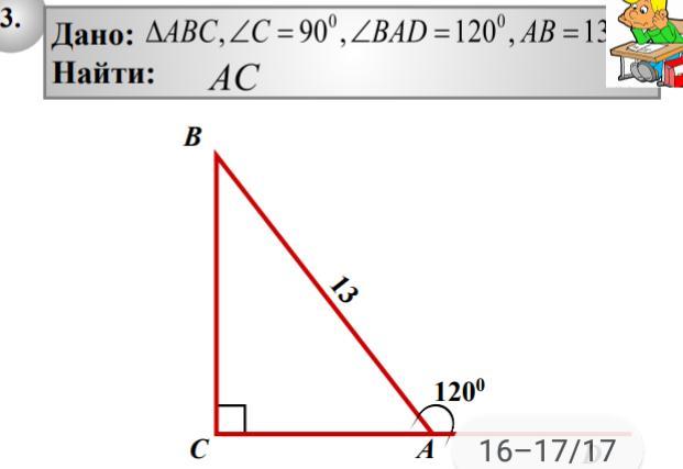 Тогда AC = AB*cos60° = AB*sin30° = 13*0,5 = 6.5 см
